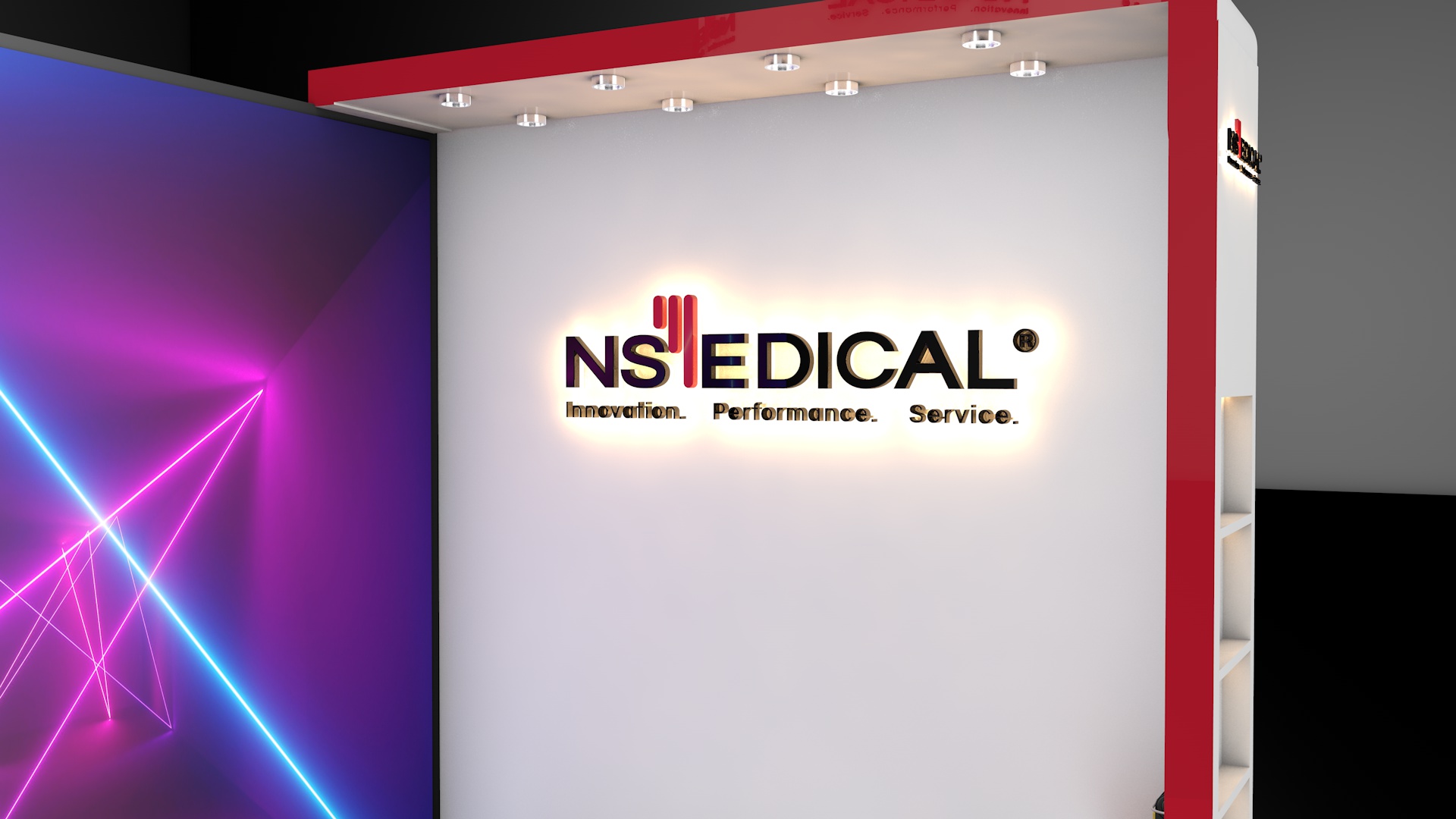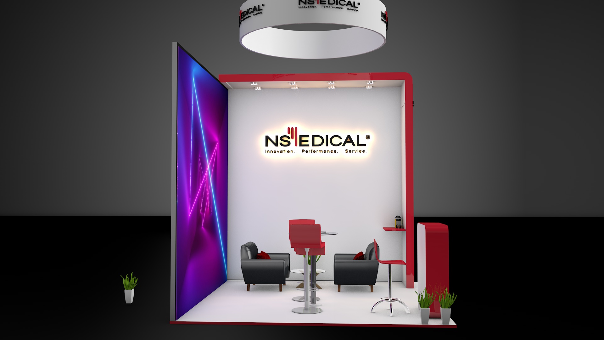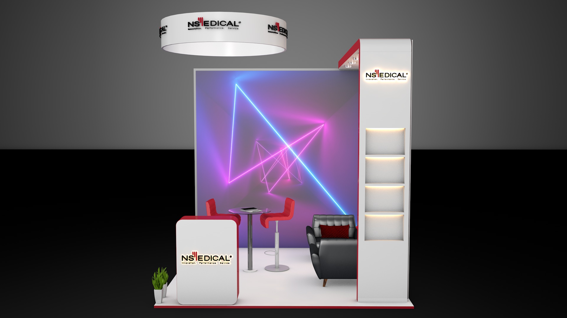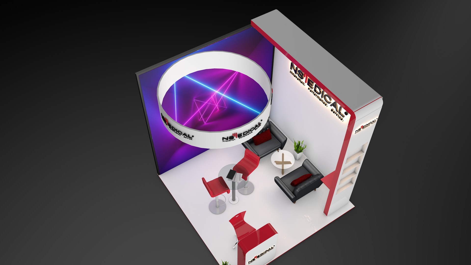 Create a 3D exhibition stand design for NS Medical with a 3x3 layout for the Marrakech Salon, focusing on functionality and brand representation.